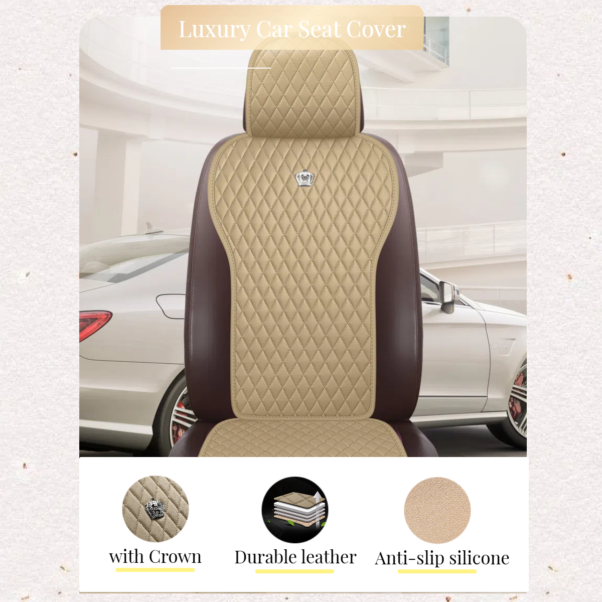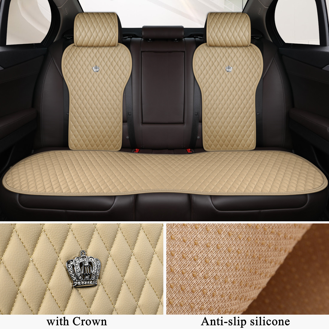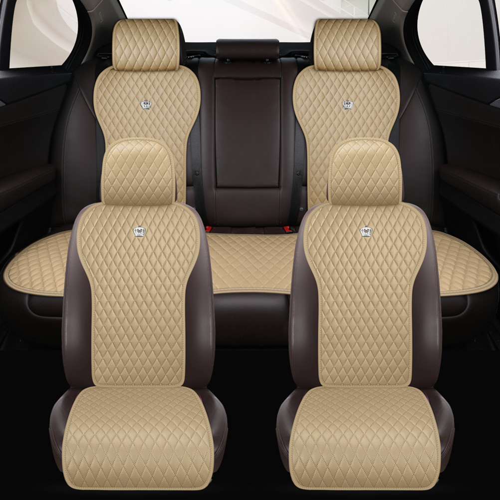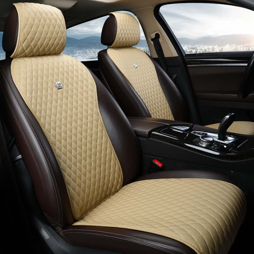 Beige Auto Seat Protector Leather Universal Seat Cushion Covers with Crown 2/3 Covered