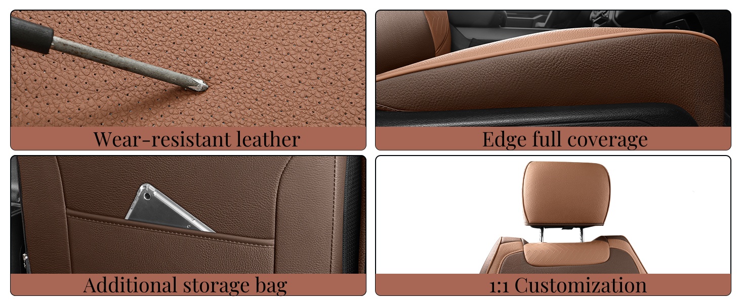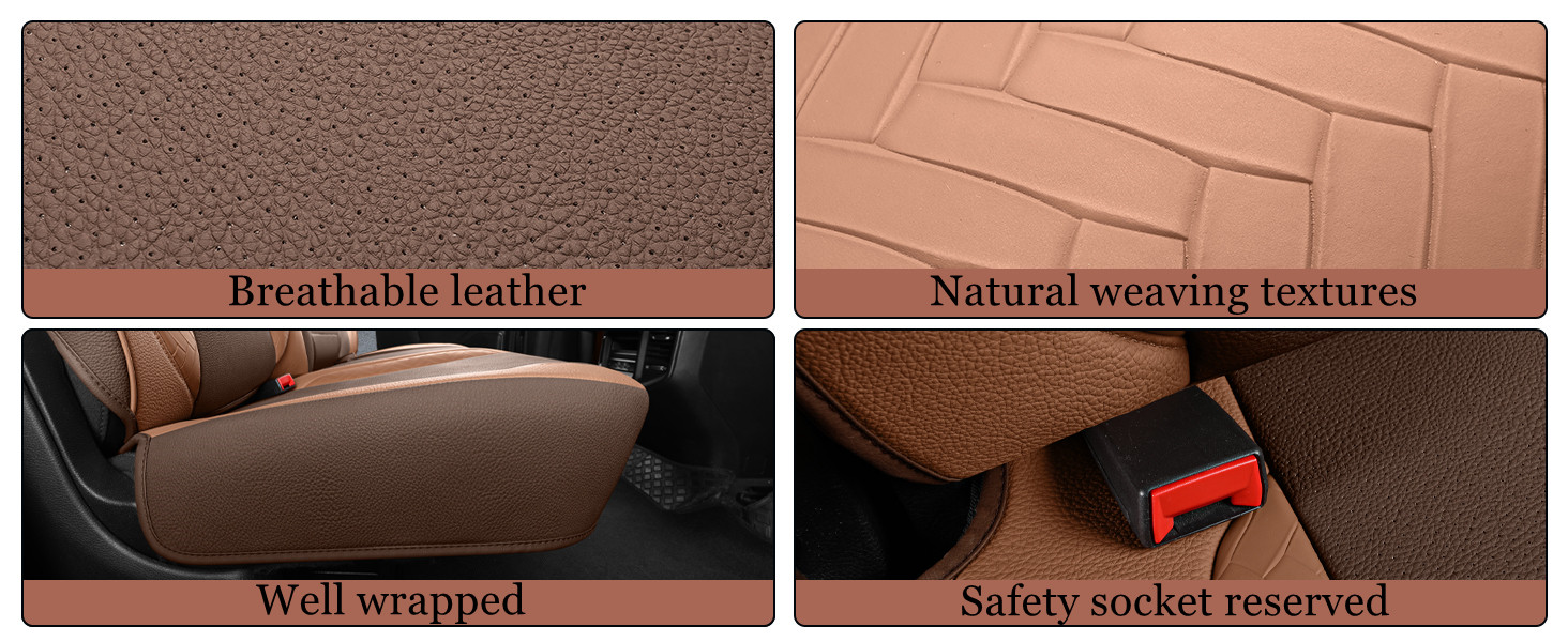 3, Pick-up seat cover is composed of multi-layer materials, contact surface has many small air holes and has good air permeability. inside layer is made of thick sponge with high resilience, front seat cover offers 360° full coverage, and is equipped with 2 sturdy zippers. there are two large pockets at the back of the front truck seat cover, which can hold books, tissues, children’s and pet toys.