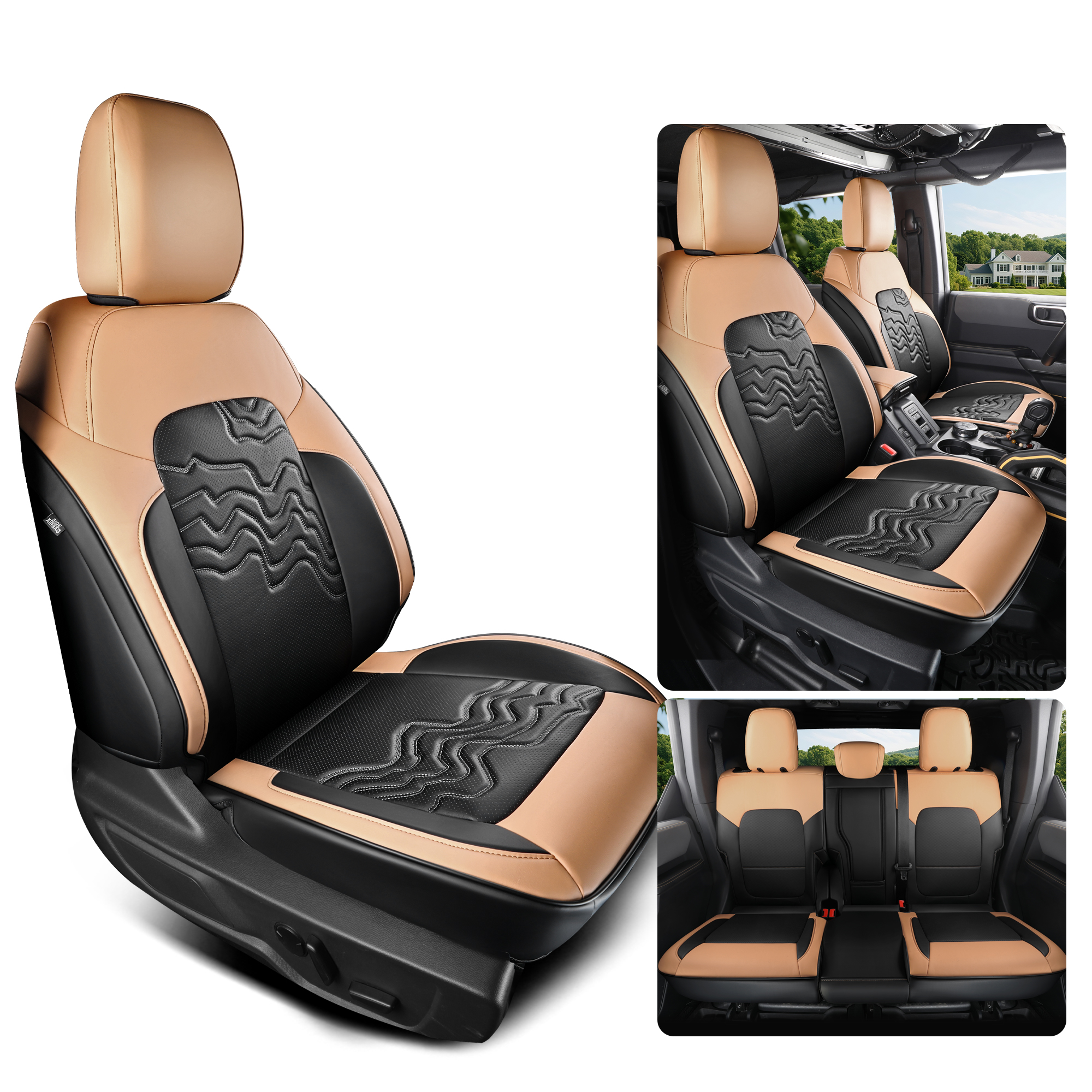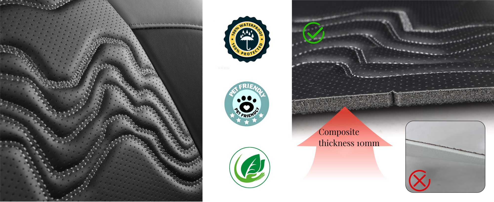 3, Made of premium quality Nappa leather, which is waterproof and wear-resistant. the thickness of composite material reaches 10mm and the weight 17.2ib. wrap surround design protects every angle of your car seats.