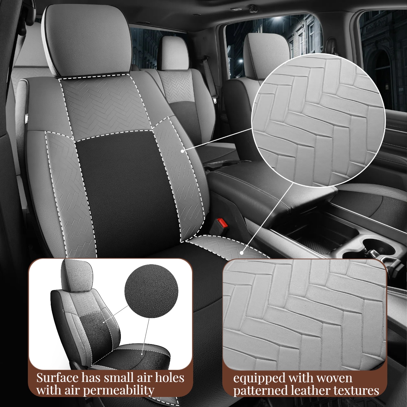 3, Contact surface has many small air holes and has good air permeability. inside layer is made of thick sponge with high resilience, front seat cover offers 360° full coverage, and is equipped with 2 sturdy zippers.