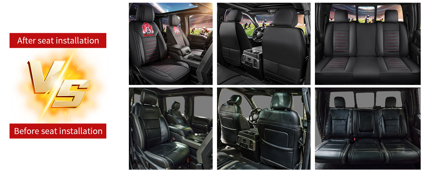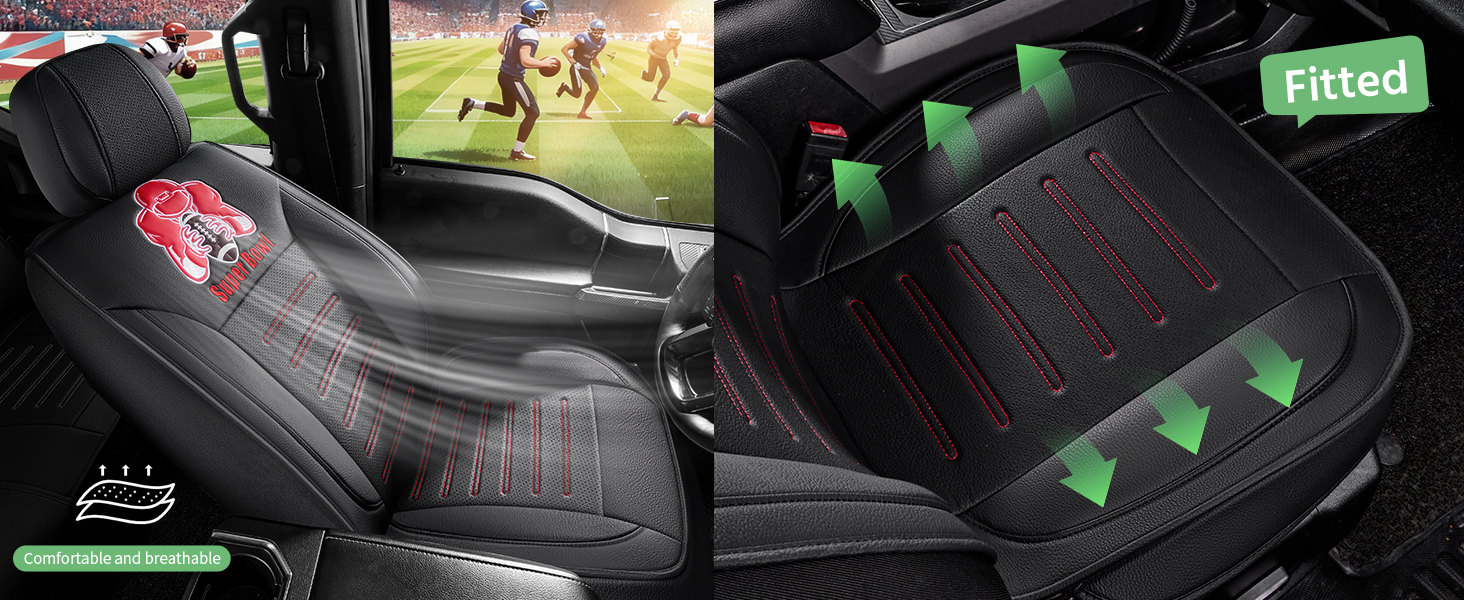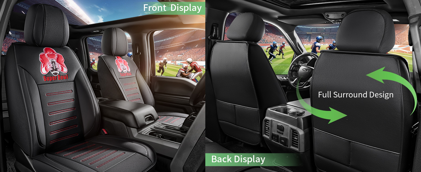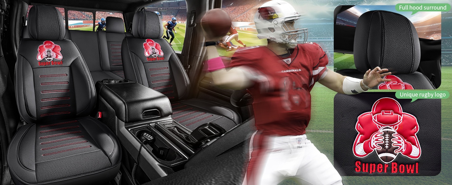 2, Each seat cover set is perfectly customized to the dimensions of the original car seat and is equipped with the “Super Bowl” logo to satisfy people’s love for sports. unique interior design makes you attract many eyes and praises.