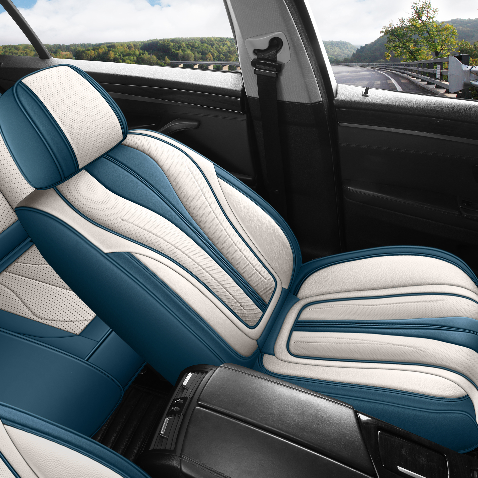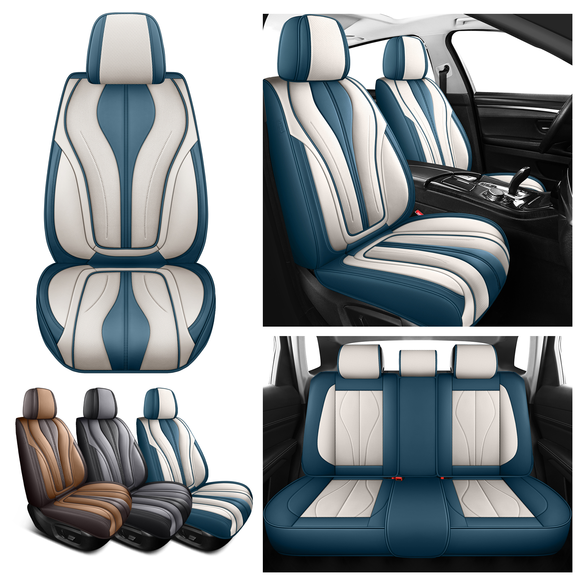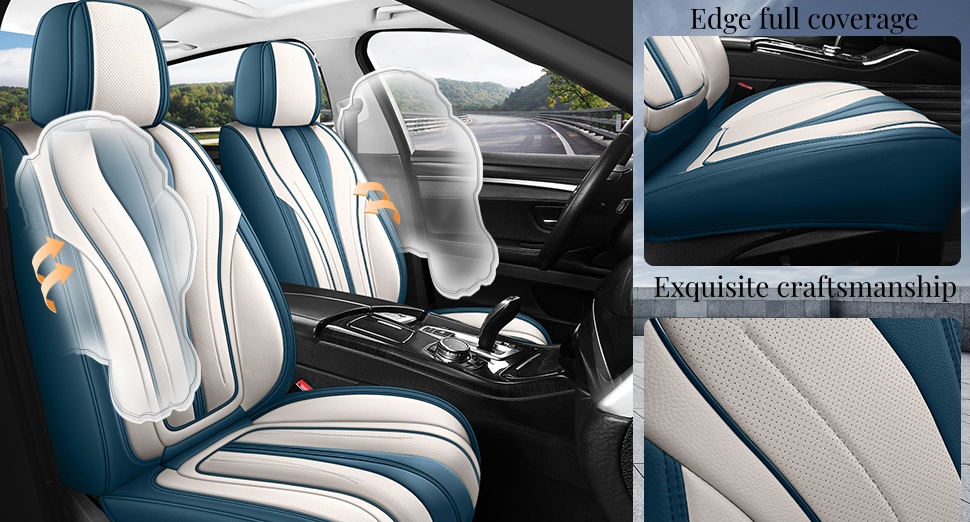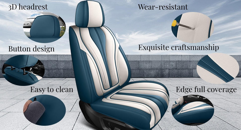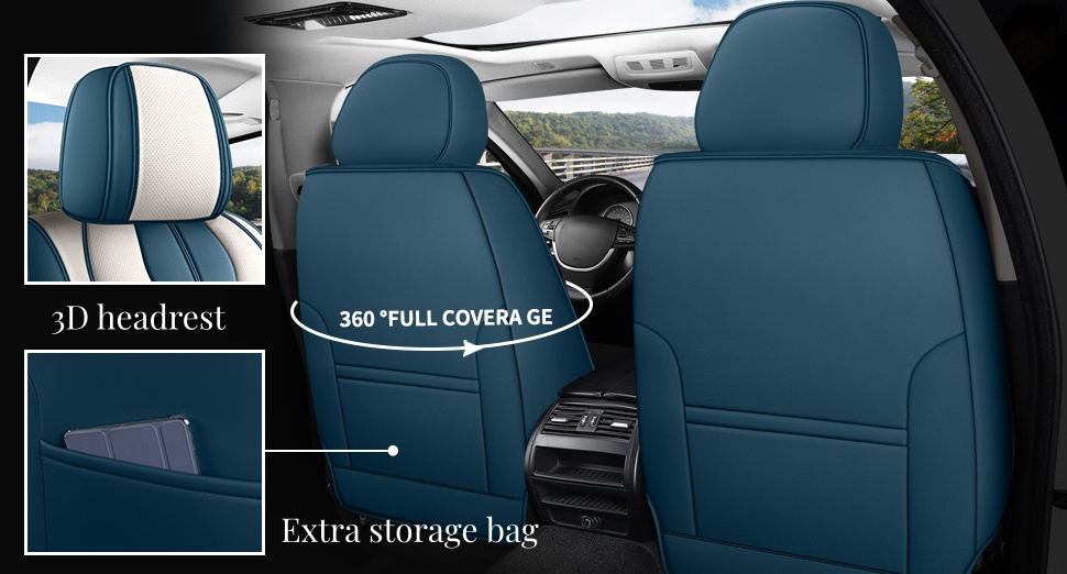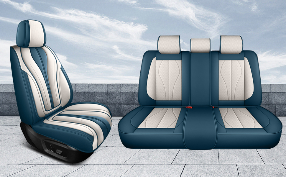 Universal Seat Covers for Cars Blue and White Full Set Waterproof Leather Full Coverage