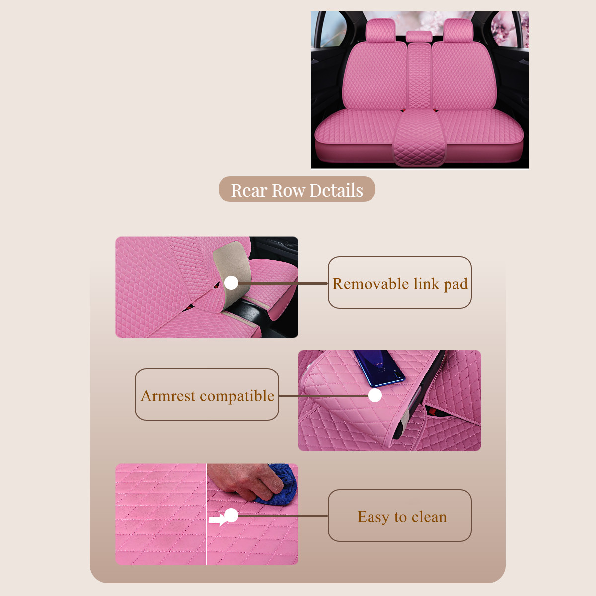 ★Rear seat cover adopts split type design, designed with adjustable length to fit different size of bench seat (50inch–56inch).